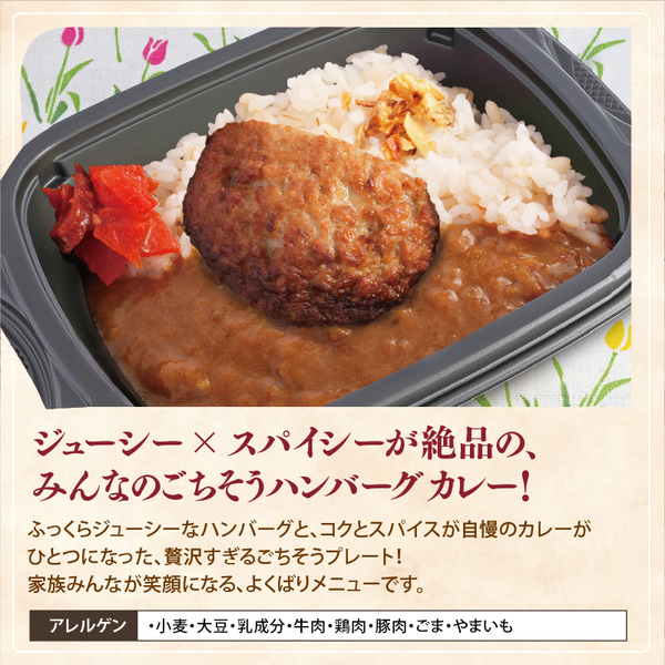 米(国産)、玉ねぎ、鶏肉、牛肉、豚肉、もち麦、福神漬け(だいこん、きゅうり、その他)、粒状大豆たん白、つなぎ(パン粉、小麦粉)、牛脂、しょうゆ、砂糖、食塩、香辛料、植物油脂、小麦粉、でん粉、カレー粉、ポテトフレーク、ポークパウダー、チキンブイヨンパウダー、ビーフブイヨンパウダー、野菜ブイヨンパウダー、白菜エキスパウダー、ローストキャベツパウダー、野菜ペースト(大豆油、なたね油、その他)、ミルポワパウダー(デキストリン、砂糖、その他)、トマト、トマトジュース、酵母エキス調味料、スパイスペースト(ソテーオニオン、しょうがペースト、その他)、クミン、ガラムマサラ(コリアンダー、クミン、その他)、酵母粉末、粉末味噌/ 調味料(アミノ酸等)、酸味料、香料、乳化剤、甘味料(ソルビトール、ステビア)、保存料(ソルビン酸K)、安定剤(CMC)、着色料(カラメル色素、黄4、赤102)