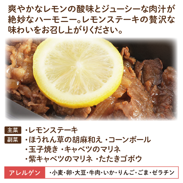 ・レモンステーキ ・ほうれん草の胡麻和え ・キャベツのマリネ ・紫キャベツのマリネ ・たたきゴボウ ・パプリカ ・ご飯