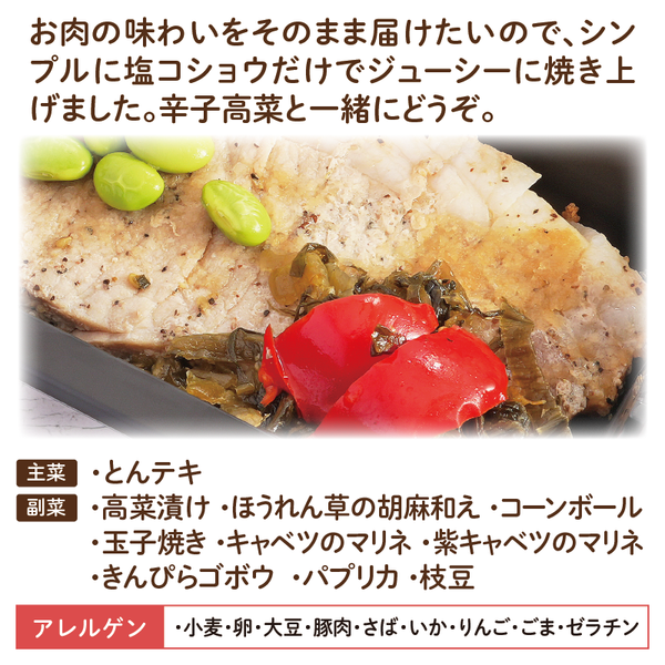 ・とんテキ ・高菜漬け ・ほうれん草の胡麻和え ・さつま揚げ ・玉子焼き ・キャベツのマリネ ・紫キャベツのマリネ ・きんぴらゴボウ ・パプリカ ・枝豆